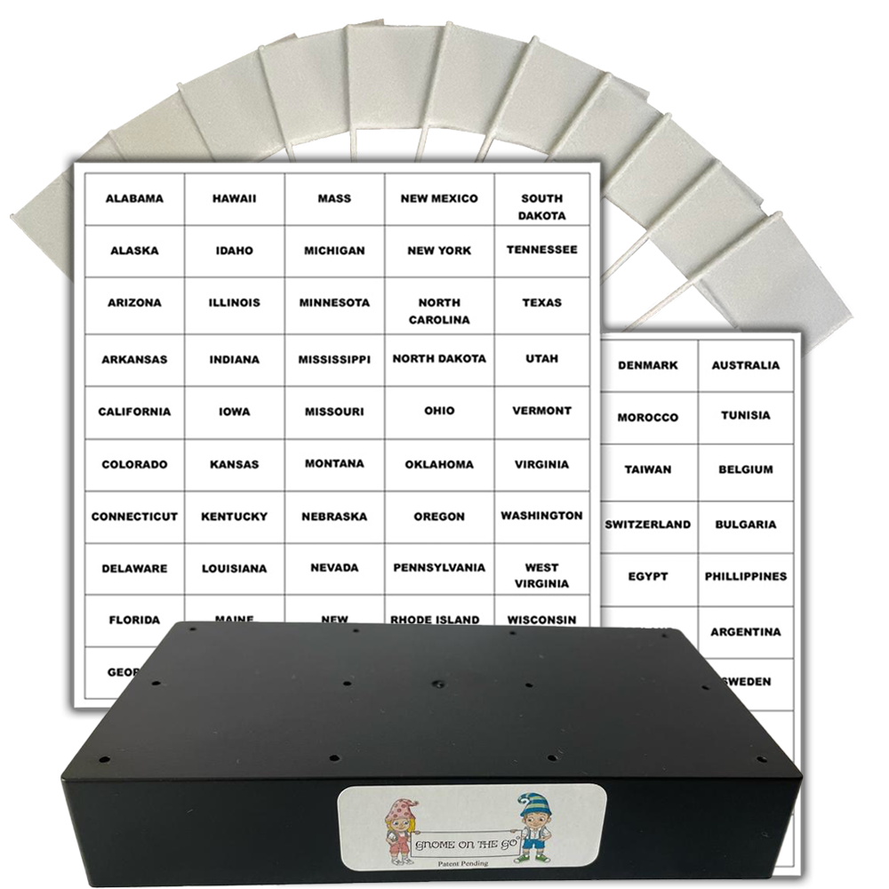 Includes 12 blank flags that fit into the Gnome on the Go display case. Each flag is 1.5 inches in length x 1.25 inches width. Warning: Choking hazard. Small parts. Not for children under 3 years.