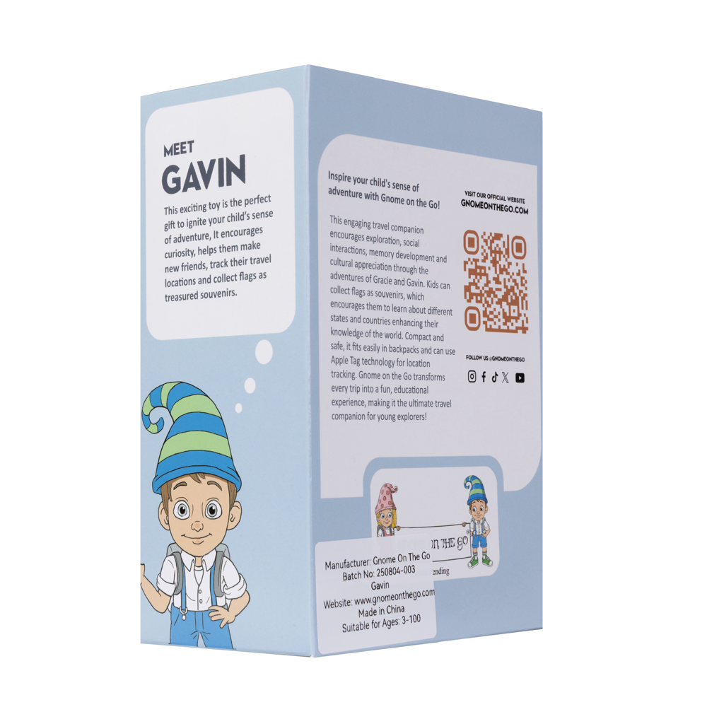 Meet Gavin, the adventurous boy Gnome on the Go—your ultimate travel companion for every journey! Gavin is more than just a travel buddy; he’s your ticket to turning every trip into a social adventure. Track your travels with ease, thanks to his backpack designed to hold an Apple AirTag (sold separately), and watch as Gavin sparks conversations wherever you go. Make new friends, snap fun selfies, and collect flags from around the world—all while sharing your experiences with the friendly face of Gavin by your side. Perfect for young travelers, families, and anyone who loves to connect and create memories, Gavin transforms ordinary travel into extraordinary adventures. Bring Gavin along and let the adventures begin!